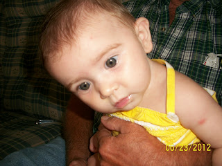 We got to spend some time with our beautiful Clair sat. in the top picture she is sitting in grand paw's lap and looking at the doggiesShe will be 6 months old next week. My sister was here with 2 of her 4 dogs but the other dog she was afraid to let get near Clair. Suzy is a sweetie but Emily is a ill dog. and we didn't wont our Clair bit.
